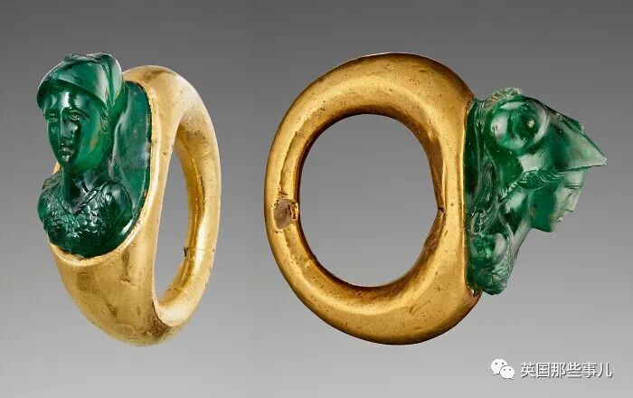 罗马金戒指,有一个浮雕的智慧女神密涅瓦,由铬玉髓制成,约公元1世纪。