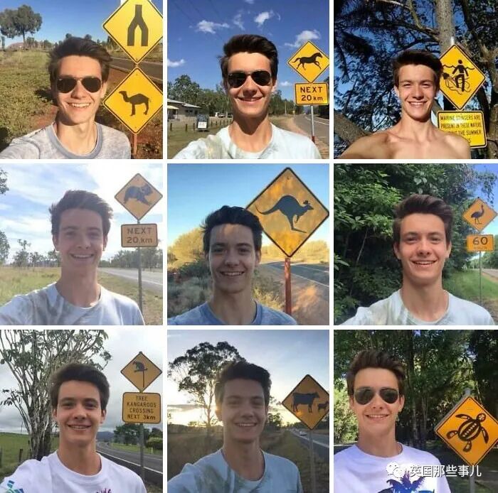 比利时小哥去澳大利亚旅行,一路上跟“小心xx动物”的警示牌拍了很多合影,看看有多少种。