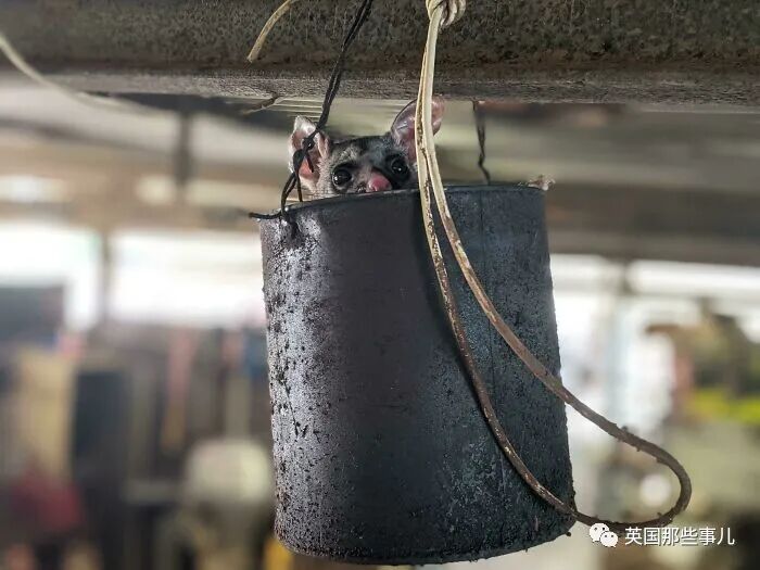 一只蜜袋鼯在我的工作间里躲猫猫。