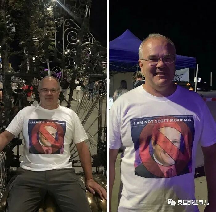为了确保他在澳大利亚旅行时的安全,我姐给他做了这件T恤,上面写着“我不是Scott Morrison”。