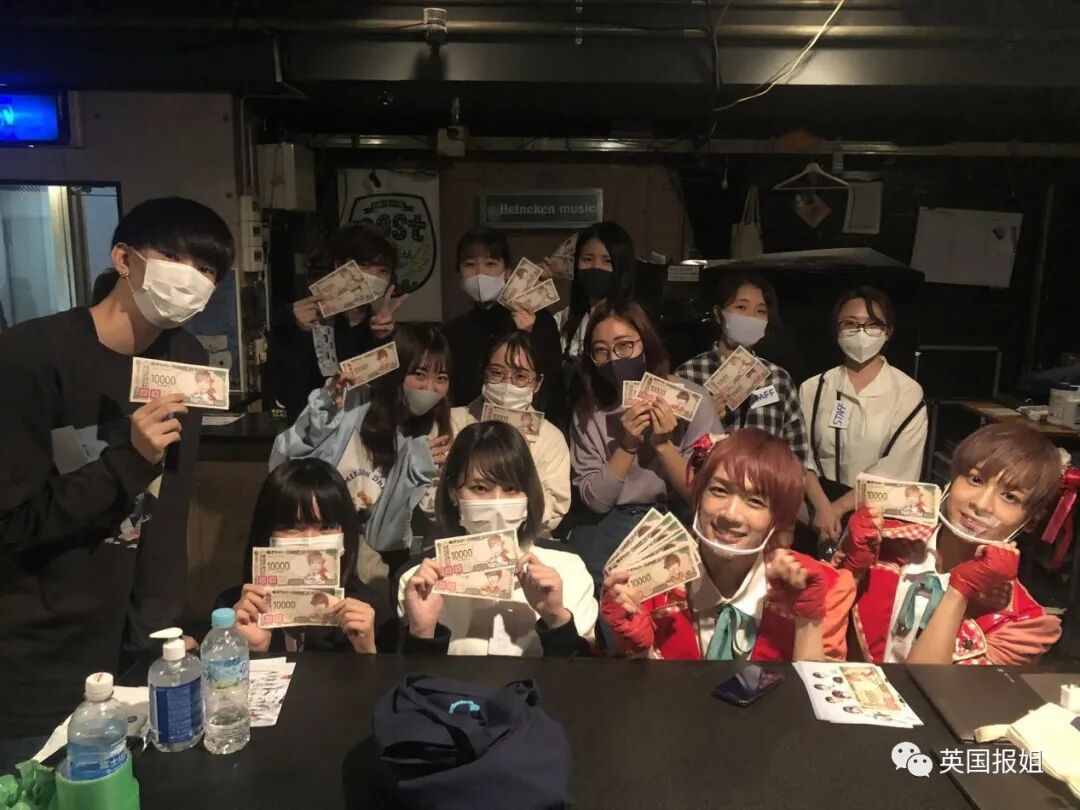 在看表演时,粉丝们会举着一万日元的钞票来为台上的偶像加油。