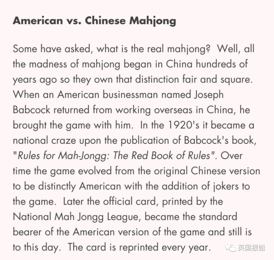 但“麻将线”这次,不仅把麻将改头换面,在介绍麻将的历史时,也只有一句话提到了中国,接着就是讲麻将在美国是如何如何发展的,她们将麻将的故事集中在一位名叫约瑟夫 · 巴布科克(Joseph Babcock)的美国商人身上。