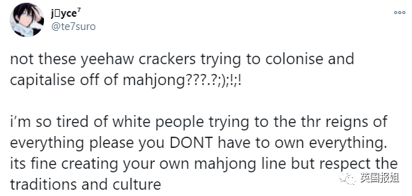 我对白人想要统治一切感到厌倦,拜托不要老想着拥有一切。创建自己的麻将生产线没啥问题,但要尊重传统和文化。