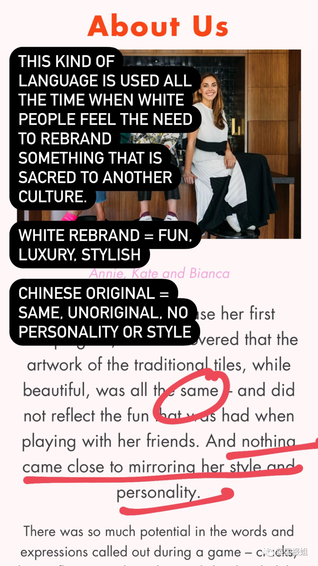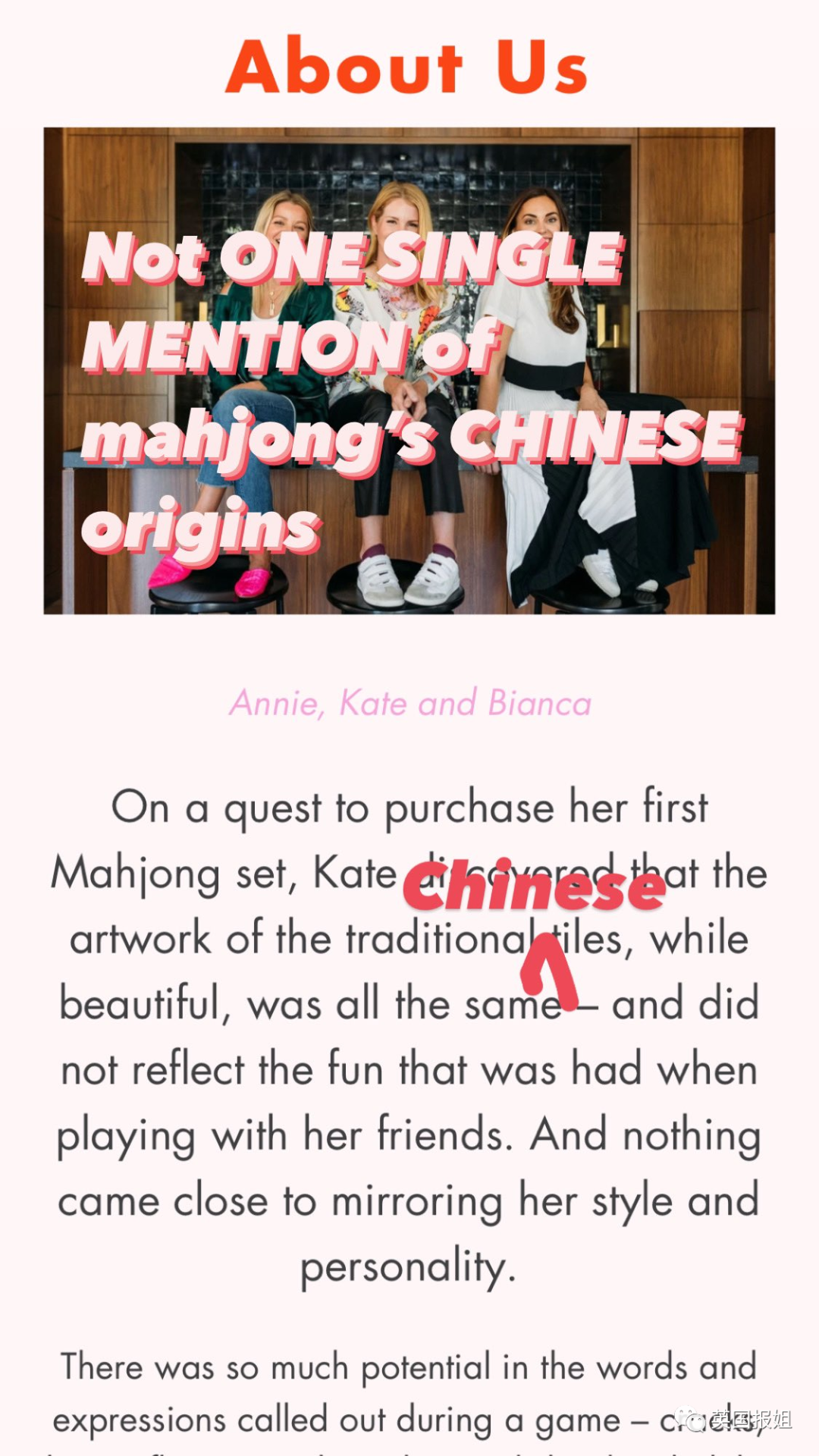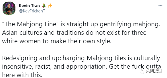 “麻将线”直接把麻将中产阶级化了。亚洲文化和传统的存在并不是为了让三个白人女性创造自己的风格。重新设计和升级麻将牌是对文化的不敏感,种族歧视和挪用。赶紧给我滚粗吧。
