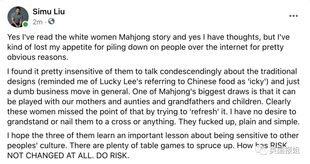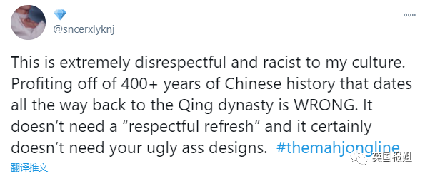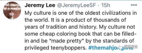 看不起还要擅自拿来占为己有的这一套彻底激怒了网民,漫威演员刘思慕也把这个品牌挂了出来,他觉得麻将是可以跟家里的亲戚玩在一块儿,联结感情的游戏,他希望大家以后都能对别人家的文化敏感一点,不要随意拿来毁了。