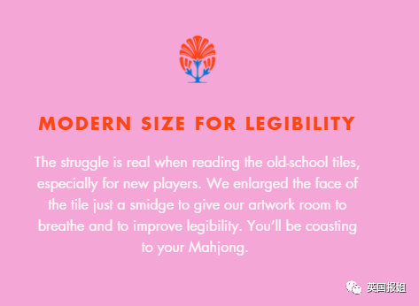 第三,清晰可辨的现代尺寸,她们把牌做得更大了一些,因为这样能更好地去识别牌面信息。凯特说她在打麻将时,要花很大的力气才能弄清楚每张牌代表的意思是什么。