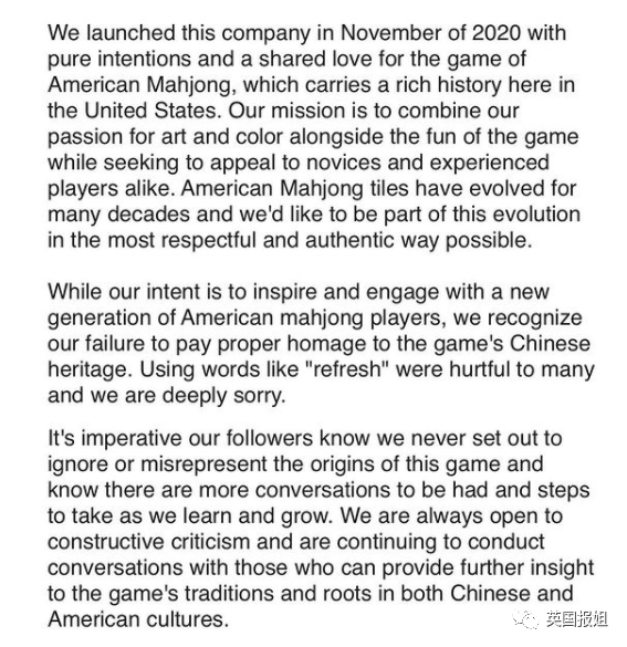 如今,“麻将线”被各方网友狙击,创始人们估计实在是没办法只好发布道歉声明,但里面说的话也很一言难尽...除了“没有对麻将的中国传统表达应有的敬意”深表歉意之外,里面还一口一个“美国麻将”,坚称他们是以“最尊重、最真实的方式”为“美国麻将”的发展做出贡献。