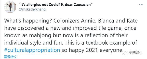 什么鬼啊?殖民者Annie、Bianca和Kate发现了一种新的、可以被改进的棋牌游戏,以前这种游戏叫做麻将,现在就是反映她们个人风格和乐趣所在的东西,这简直就是文化挪用的教科书案例嘛