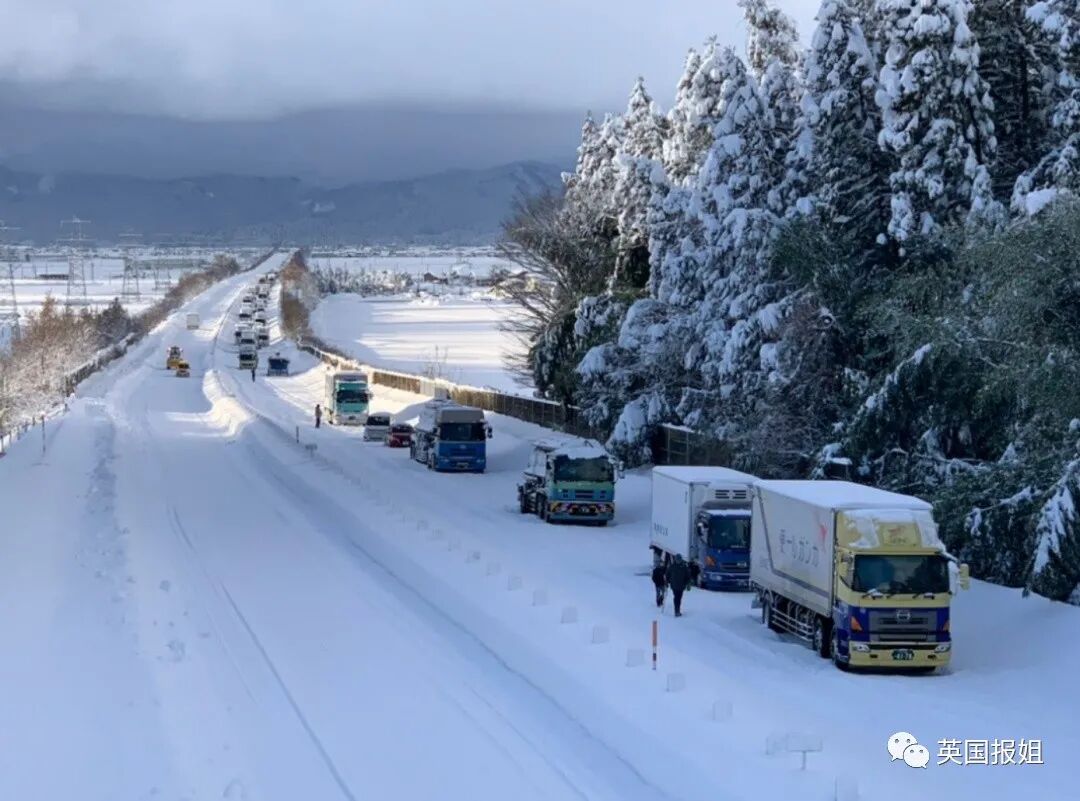 在福井县,积雪达到104公分,超过往年5倍。多条高速公路中断,上千辆车困在桥上无法脱困,为了防止油量耗尽,很多人只能选择熄火,裹在衣物里瑟瑟发抖等政府的救援。