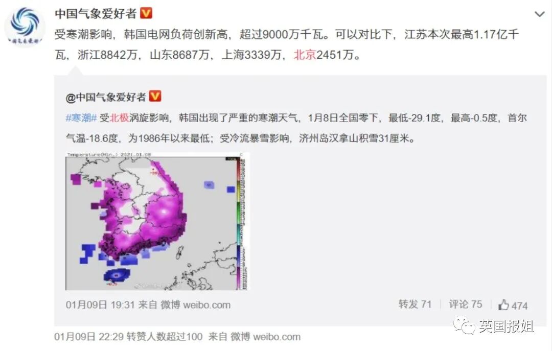 在东亚,中国的其他邻居也都冷到发抖。受寒潮影响,韩国电网负荷创下新高,超过9000万千瓦。