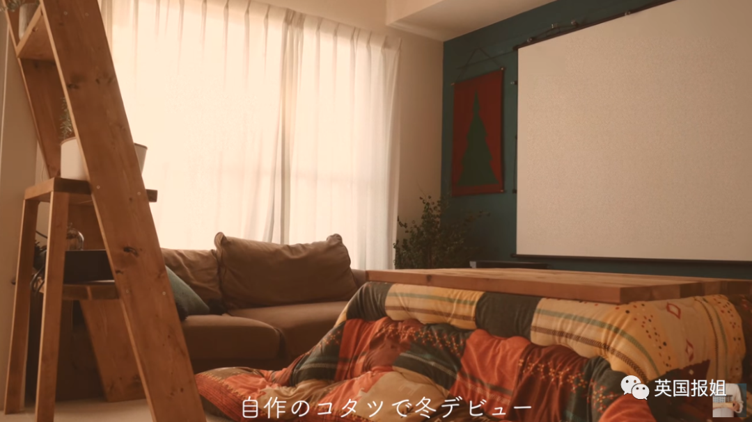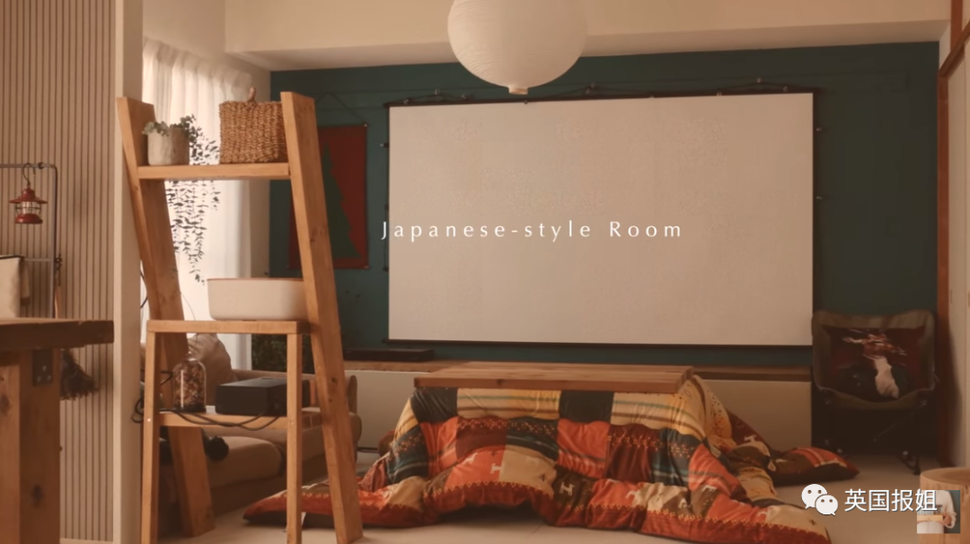 投影仪、幕布、粉刷成绿色的墙壁...想象一下寒冷的雨天窝在被炉里看一部喜欢的电影,肯定超级满足。