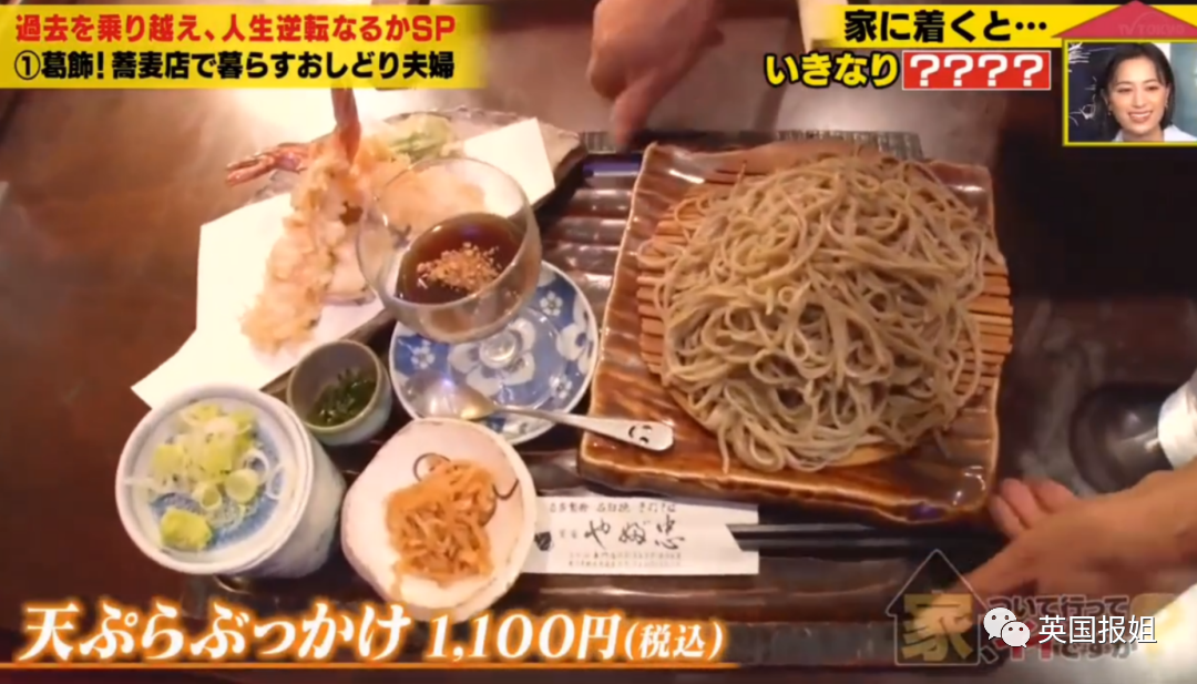 相对于奶奶的热情,爷爷在镜头前稍显拘谨。两人给摄影师小哥准备了天妇罗荞麦面,1100日元(约64元)的价格看起来超划算。