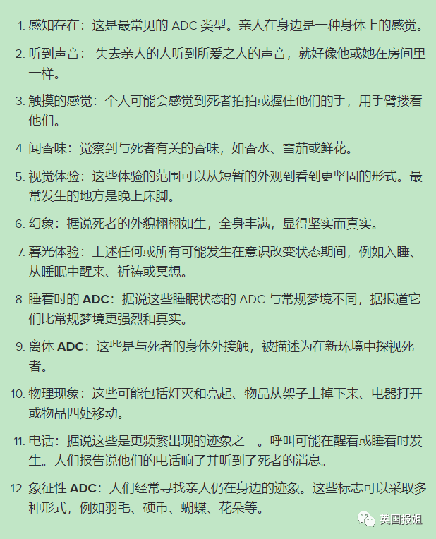 几天后玛丽又告诉医生自己碰到了ADC事件。她和丈夫在煮妈妈最喜欢喝的菠菜汤时,突然两人都闻到了一股属于妈妈的香味——是白钻香水和她最爱的发胶混合起来的味道。