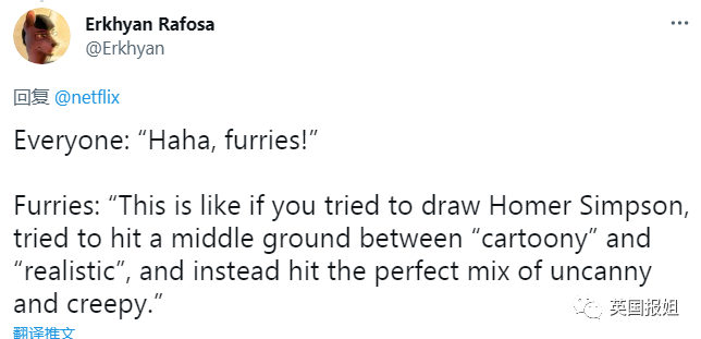 福瑞控:这就好比你试图画出荷马·辛普森(《辛普森一家》中的人物),想在‘动画化’和‘现实主义’之间找到一个中间地带,结果却得到了一种神秘与恐怖的结合体。”