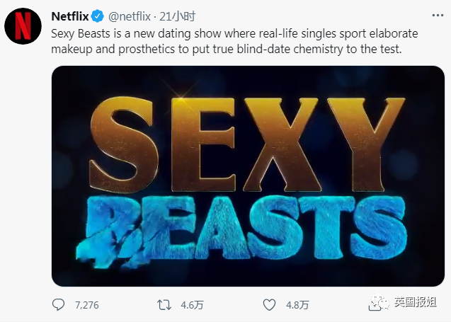 今天刷到一条推特,看得人满脸问号。网飞新出了款相亲节目叫《性感野兽》(sexy beasts),这个节目的主旨大概就是“检验单身男女们在相亲时产生的真正化学反应”。