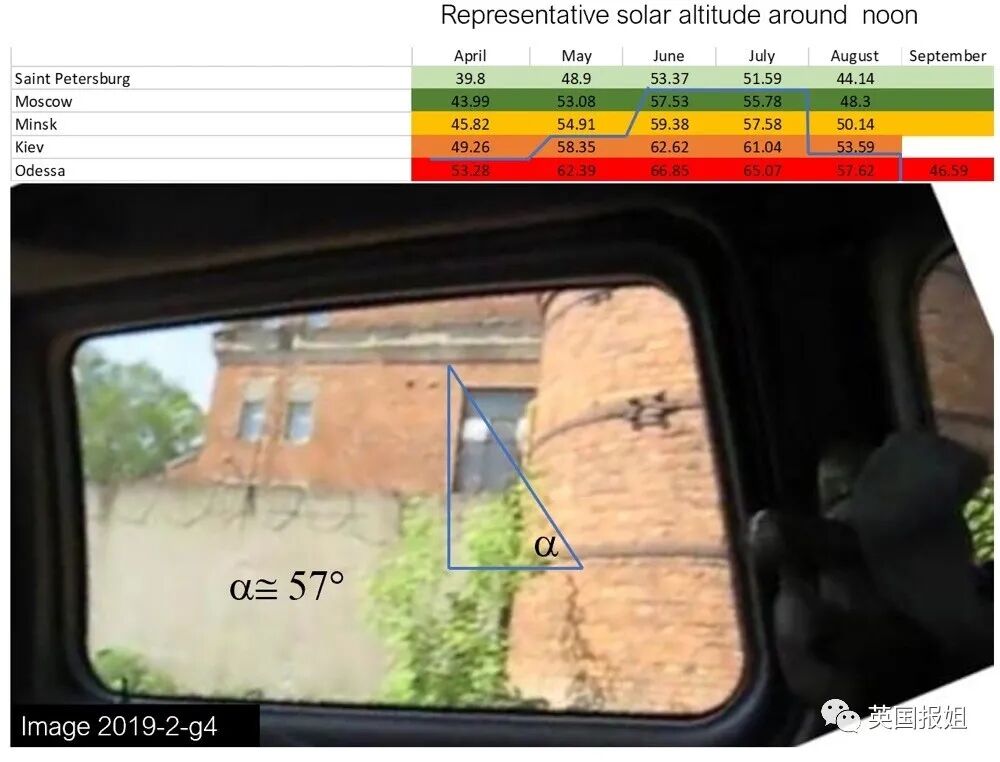 然后,他们通过图片中植物影子的形状,计算出了地点当时的太阳高度角为57度。由此排除了圣彼得堡周围地区,因为那里纬度较高,常年太阳高度角不会达到57度。