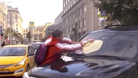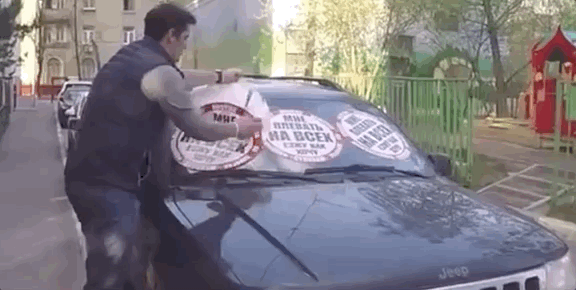 第三步·扒车:不得不说俄罗斯人真的刚,就算你用锅那么大的贴纸挡住他开车的视线,也有俄罗斯司机照样往前开。