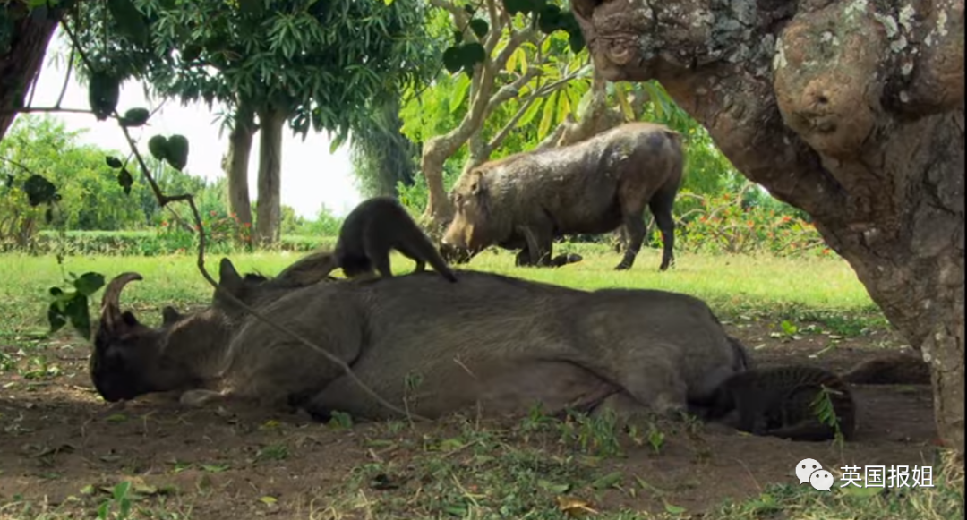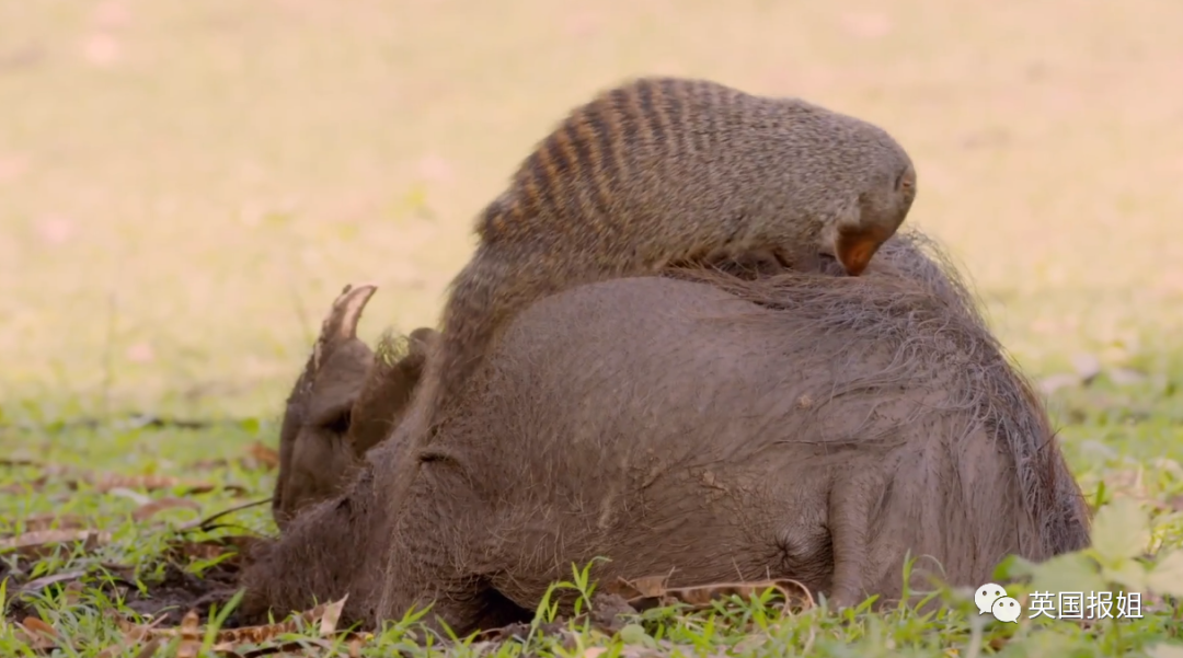 甚至,在看到猫鼬的时候,疣猪会主动趴窝,让猫鼬能够轻松“上桌”。