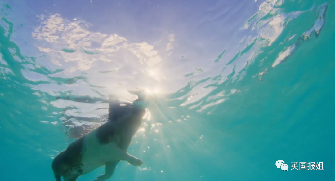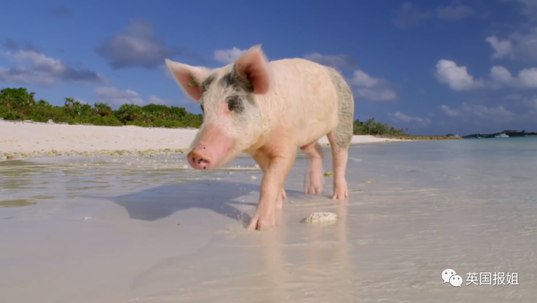 在巴哈马的一个偏僻孤岛,一群猪猪快乐地生活在这里。