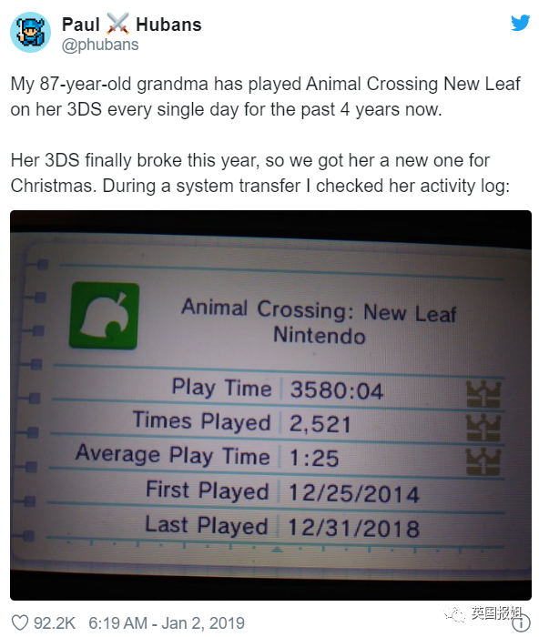 87岁的奶奶从2012年起,在3DS版本的动森里“生活”了3500多个小时。去年二月,有上百万网友见证了奶奶的这份喜爱和执着。