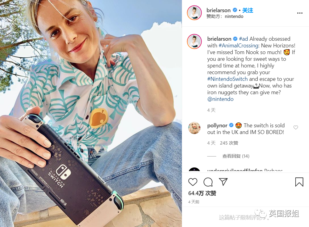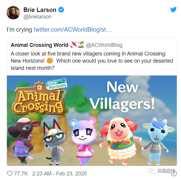 “惊奇队长”Brie Larson也是动森的粉丝,曾多次转发相关内容的她在游戏发售日得到了官方提供的游戏同款衣服和限定机。