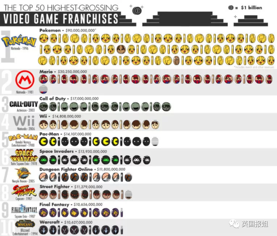 史上最赚钱的游戏IP排名,任天堂的“宝可梦”和“马里奥”以碾压之势霸榜 图源:TitleMax