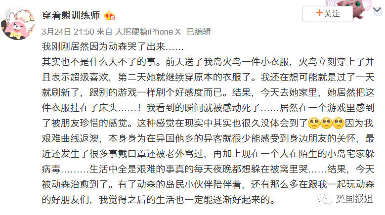 这款游戏陪伴不少人长大,甚至还陪伴很多人变老。很多铁杆粉丝感叹,动森不仅仅是一款游戏,更是一种生活,一种逃离现实的方式,一种无可言说的温暖。