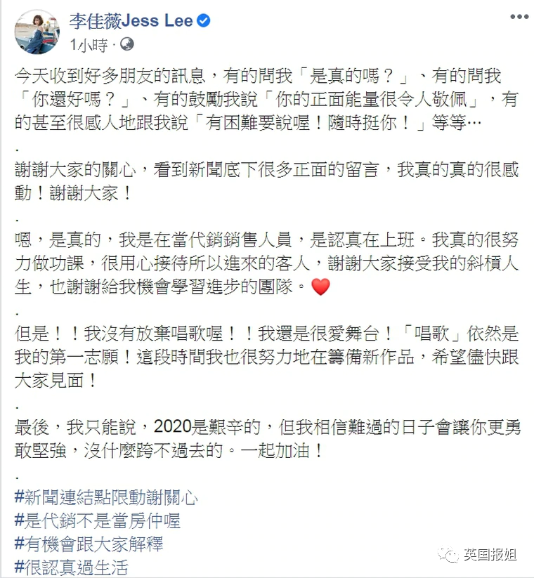 殊不知这之后她与公司合约到期,最近又因为疫情冲击,无法正常开始作为独立歌手的工作。于是她跑去做了房地产中介。