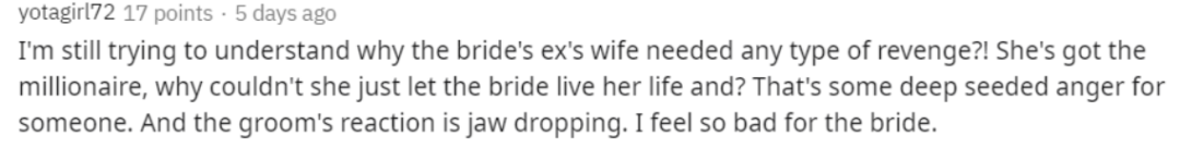 “我不能理解的是,为什么新娘的前情人的妻子需要用这种手段来报复?她已经有了财富,让这位新娘自生自灭不就行了?