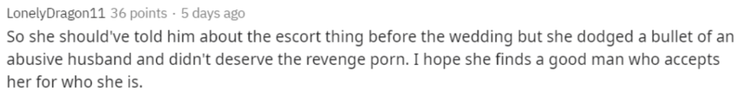 但虽说如此,她也不应该遭受身体虐待,更不应该遇到色情复仇。希望她能找到接纳自己过去的人。”