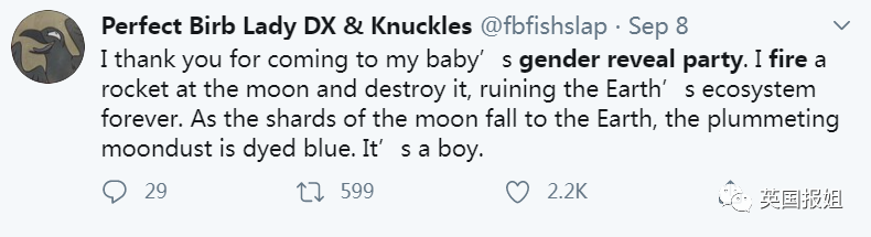 “感谢大家来到我家宝宝的性别揭示派对。我对月发射火箭彻底摧毁地球生态系统,月亮的碎片落到地球时,坠落的月尘是蓝色的。