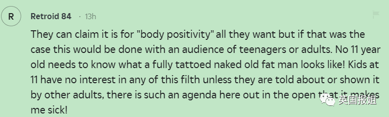 他们可以声称这是为了取消身体歧视,但如果是这样,参与节目看裸体的应该是成年人或者青少年,而不是让11岁的儿童看对浑身是纹身的胖老头的裸体。