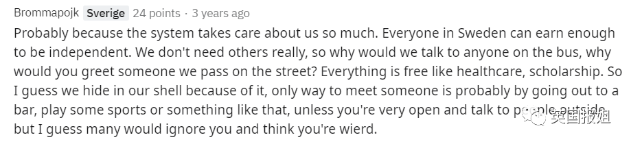 “我们被福利系统养得很好。在瑞典,每个人都能挣到足够的钱独立生活,理论上真的不需要依附别人。所以为什么要在公共汽车上和陌生人说话、在街上和路过的人打招呼呢?