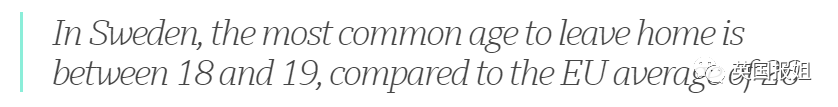 与欧盟统计局给出的年轻人首次搬出家里独自居住的平均年龄26岁相比,瑞典年轻人第一次独居的年龄一般在18、19岁。