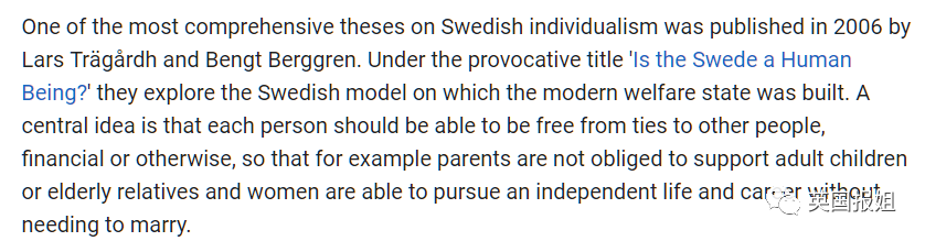 而除了独居文化,瑞典的其他观念也反映出这种一个人生活的态度。瑞典人更希望自己是一个独立的个体,生活的意义不需要依附于和他人之间的社会关系。