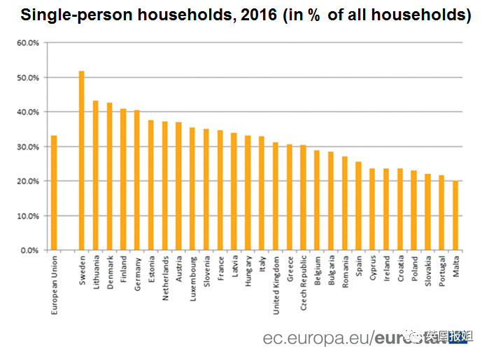 而在瑞典,一人生活的比例反而要占到大多数:欧盟统计局曾经的一项调查表示,2016年瑞典有约52%的户数是独自一人居住的——我们印象中和家人一起组成的“家”,在这里反而成了少数人的选择。