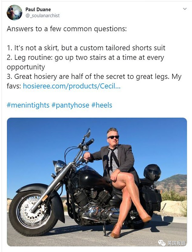 机车够不够硬?美国机车党大叔Duane就很喜欢西装配热裤+高跟鞋: