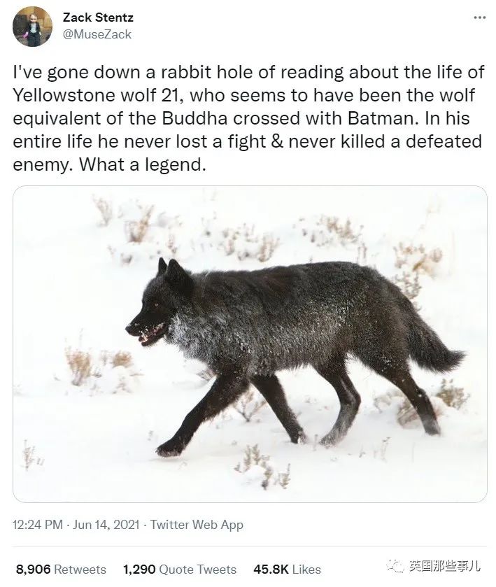 写了《雷神》和《X战警:第一战》的编剧扎克·斯坦之(Zack Stentz),在今天意外推红了一只生活在黄石国家公园的狼。用他的话说,这只名叫21的公狼,是“佛陀和蝙蝠侠的结合体”,一生从未打过一场败仗,也从未杀死过一个手下败将。