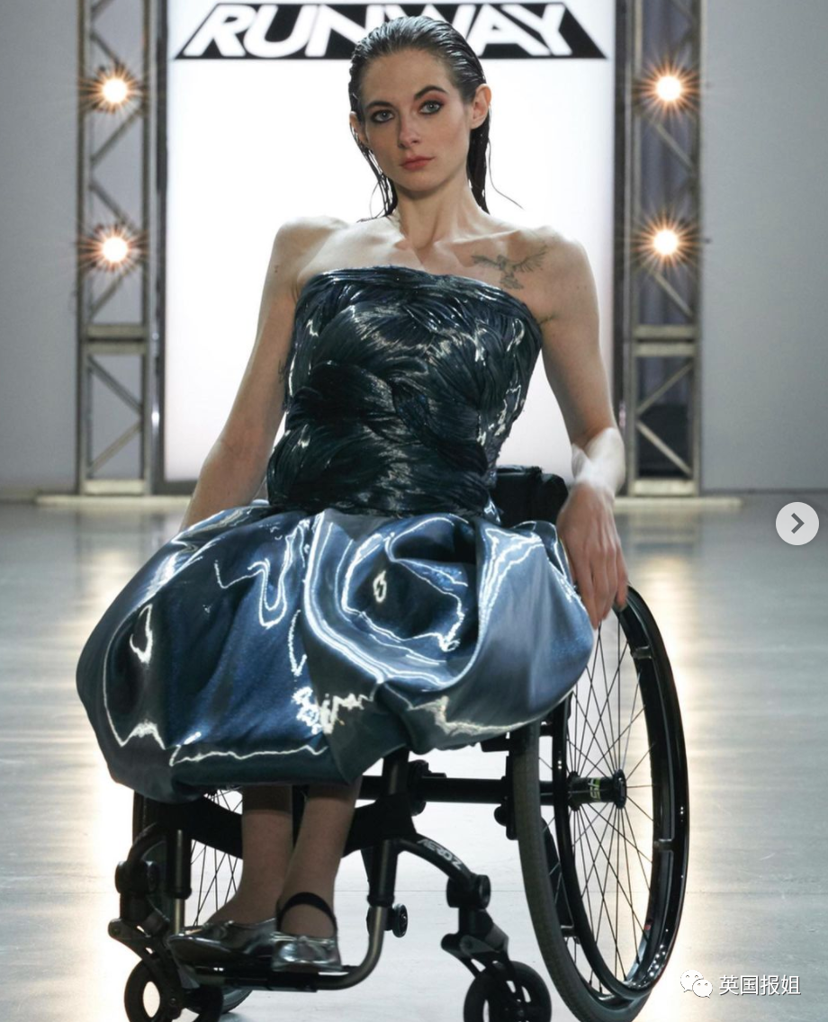 去年,她受邀登上了著名的服装设计选秀节目《天桥风云》,为设计师定制的服装走秀。这可能是很多观众第一次在电视上看到女孩乘着轮椅走t台。