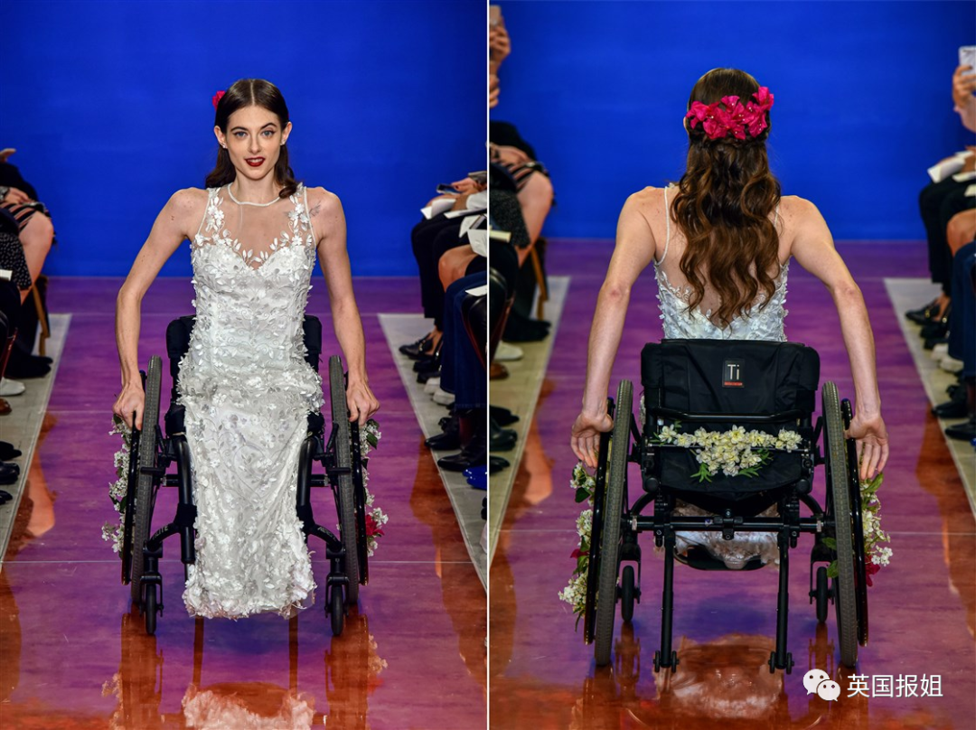 Bri的故事也打动了THEIA品牌的创意总监。在纽约婚纱时装周上,他们决定突破,首次聘用乘坐轮椅的残疾模特展示自己的服装。