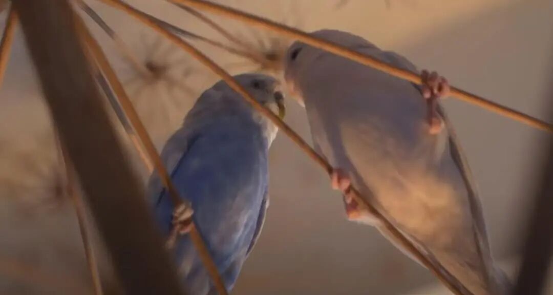 两只鹦鹉立刻变得非常熟络,头挨着头,叽叽喳喳地仿佛在聊些什么……