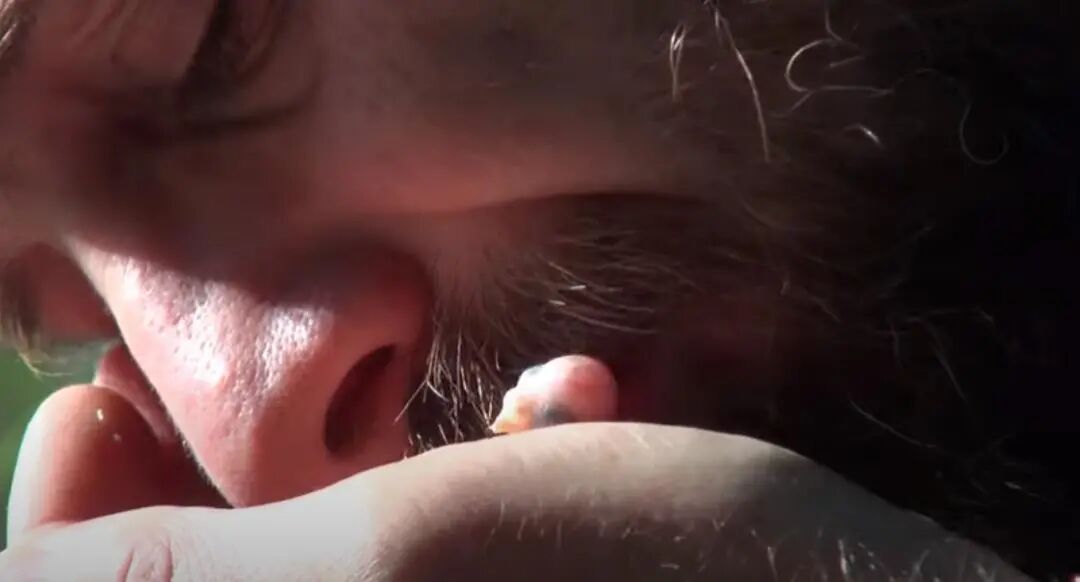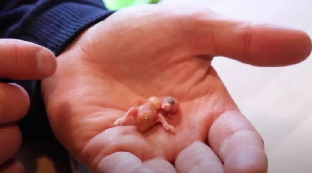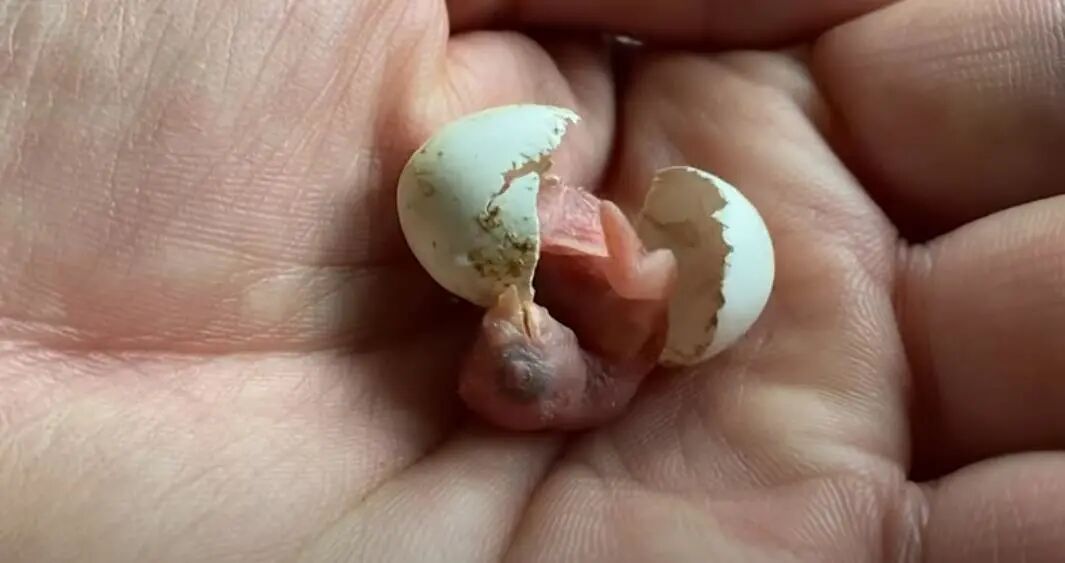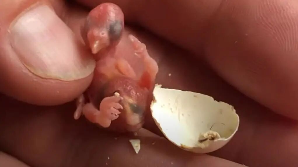 大叔发现,小鸟的脐带没有完全脱落,还黏在蛋壳上。