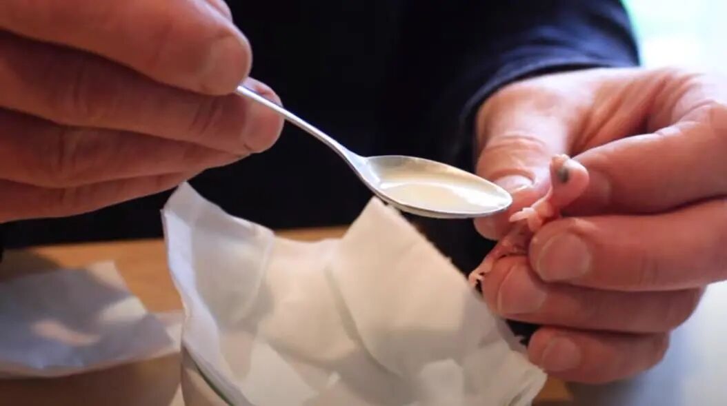 然后小心翼翼地把小鹦鹉托在手上,靠近汤匙……