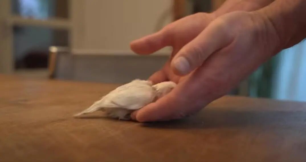 随后,大叔找来了一把剪刀,帮助小鸟剪断了脐带。