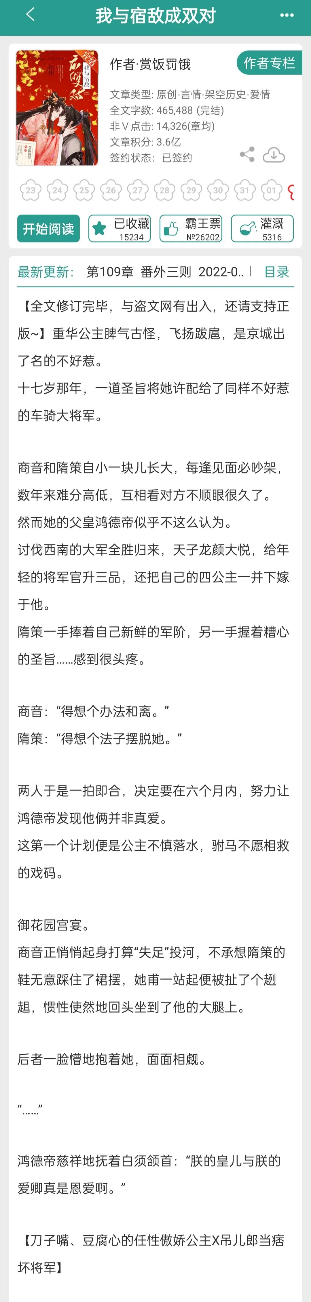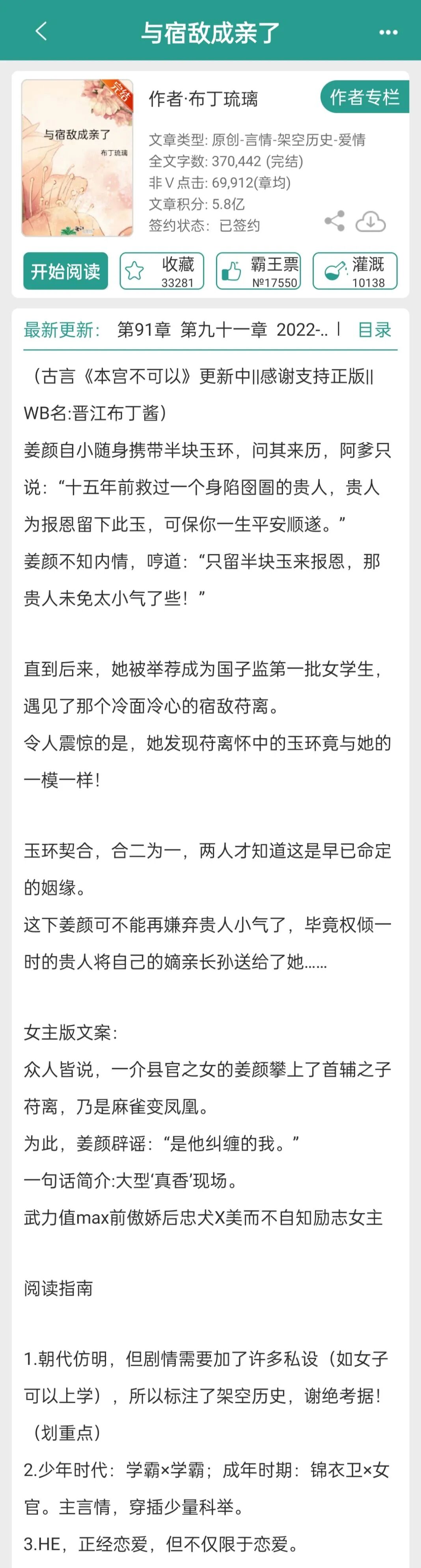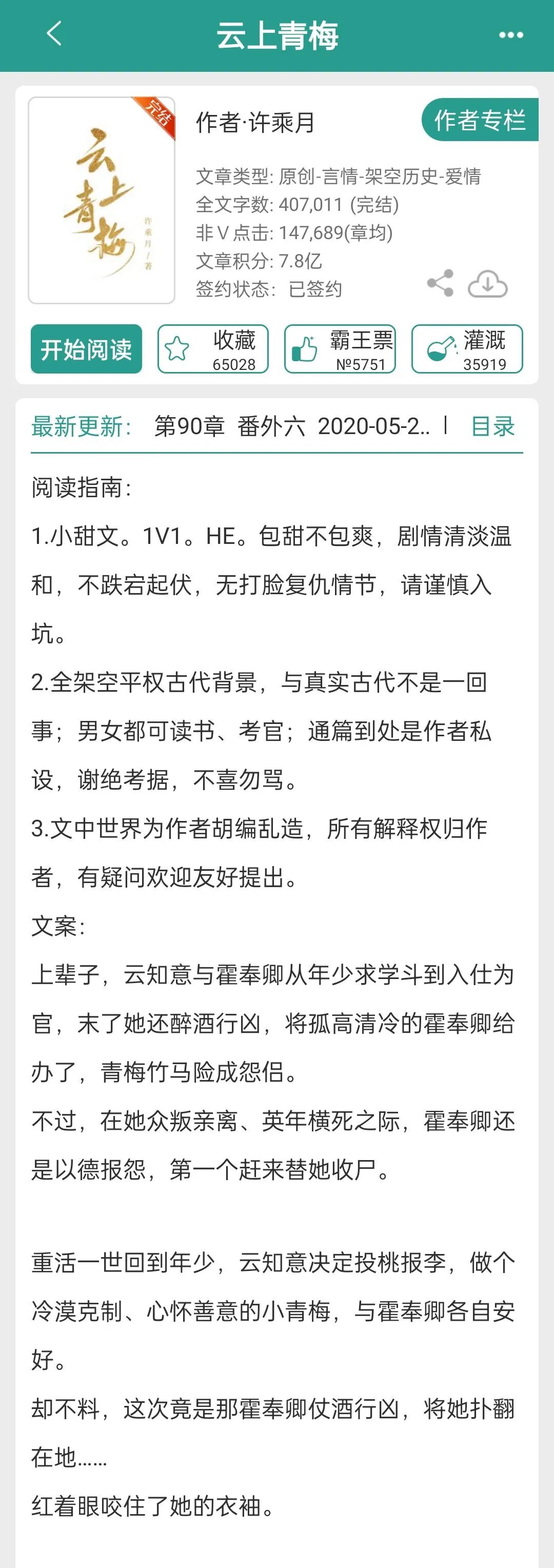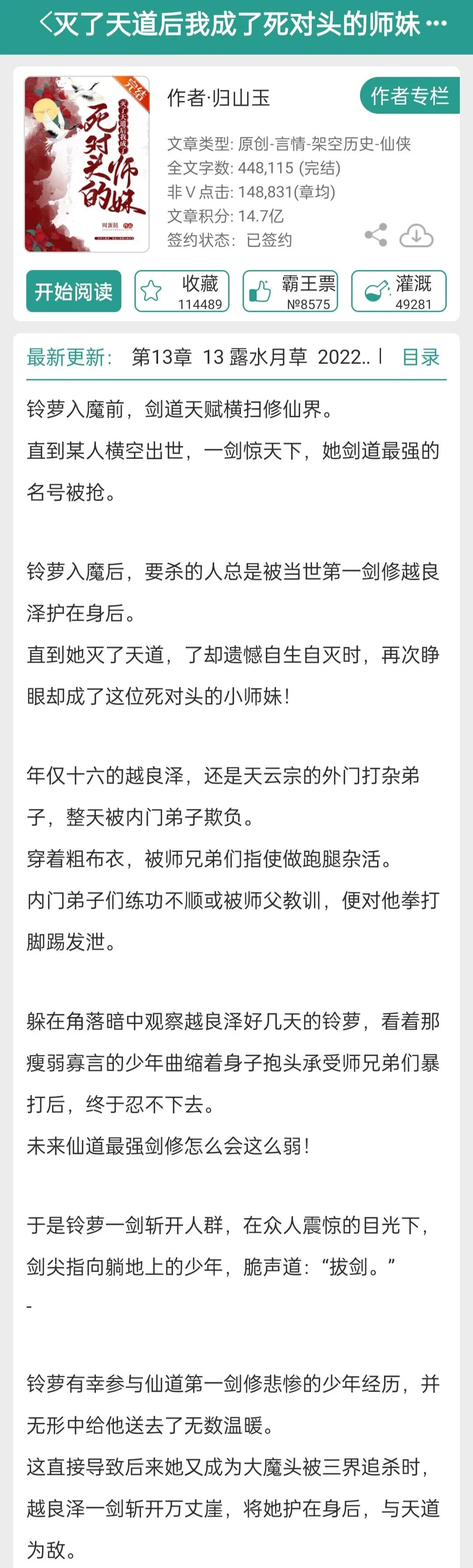 1.《云上青梅》BY 许乘月2.《灭了天道后我成了死对头的师妹》BY 归山玉3.《我与宿敌成双对》BY 赏饭罚饿4.《天作不合》BY 许乘月5.《长公主》BY 墨书白6.《物色》BY 时镜7.《金粉》BY 青铜穗8.《一时冲动,七世不祥》BY 九鹭非香 9.《夫君位极人臣后》BY 维和粽子 10.《与宿敌成亲了》BY 布丁琉璃11.《予我千秋》BY 行烟烟12.《深宫缭乱》BY 尤四姐13.《和死对头互穿后》BY 乌合之宴14.《情兽》BY 温昶