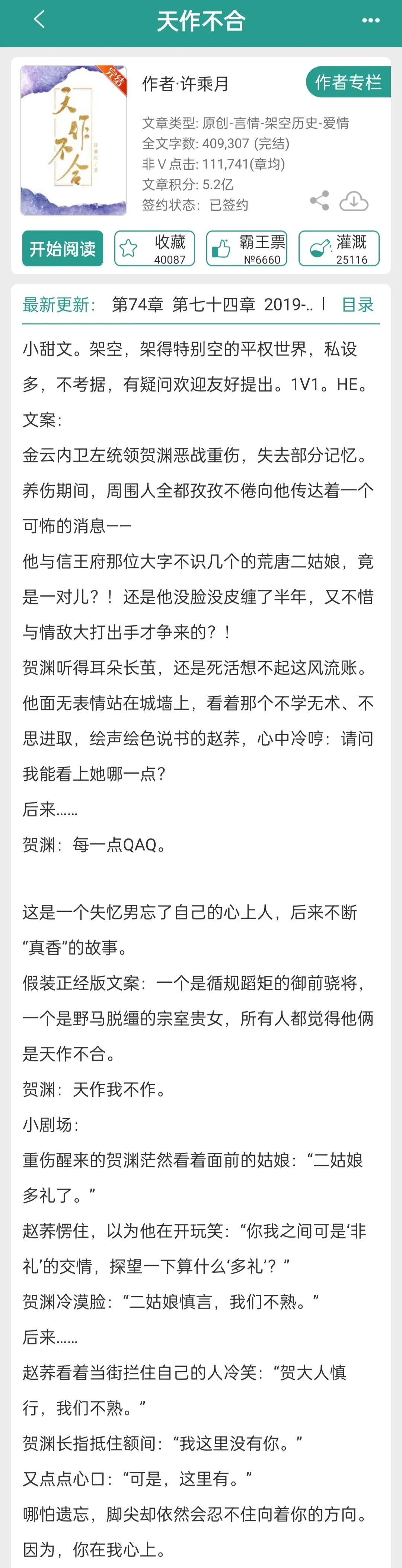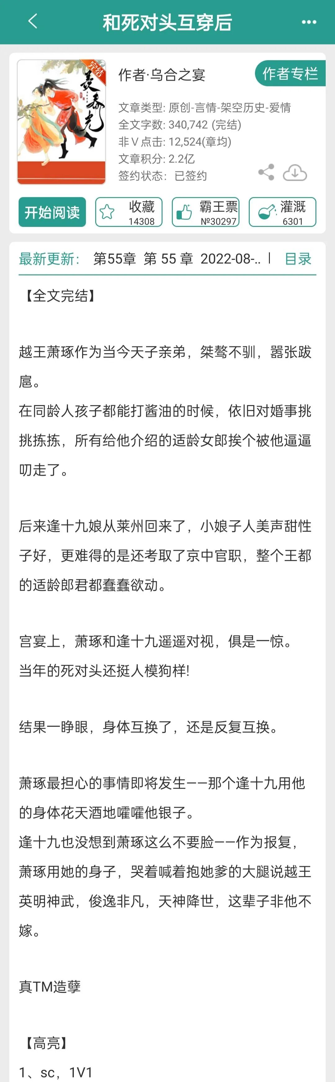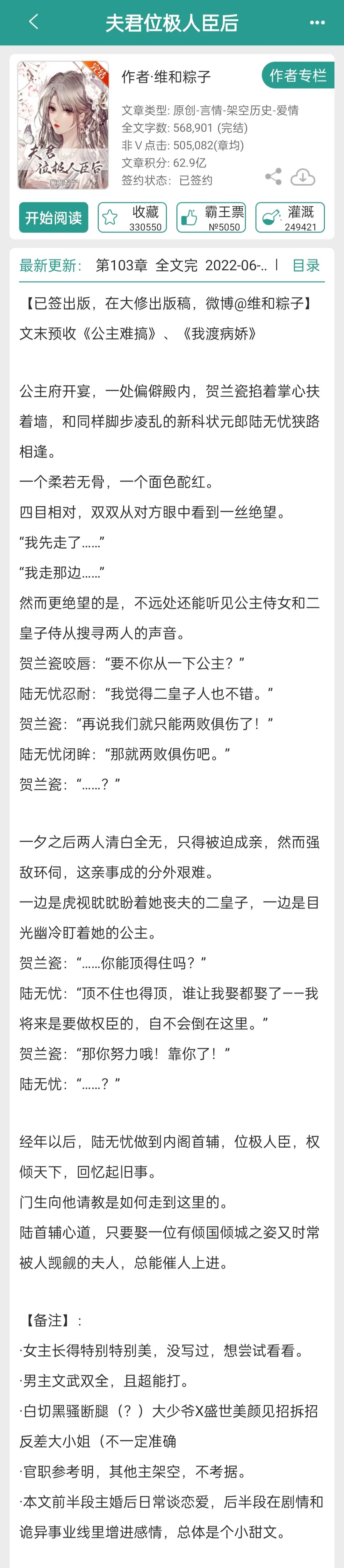 1.《云上青梅》BY 许乘月2.《灭了天道后我成了死对头的师妹》BY 归山玉3.《我与宿敌成双对》BY 赏饭罚饿4.《天作不合》BY 许乘月5.《长公主》BY 墨书白6.《物色》BY 时镜7.《金粉》BY 青铜穗8.《一时冲动,七世不祥》BY 九鹭非香 9.《夫君位极人臣后》BY 维和粽子 10.《与宿敌成亲了》BY 布丁琉璃11.《予我千秋》BY 行烟烟12.《深宫缭乱》BY 尤四姐13.《和死对头互穿后》BY 乌合之宴14.《情兽》BY 温昶
