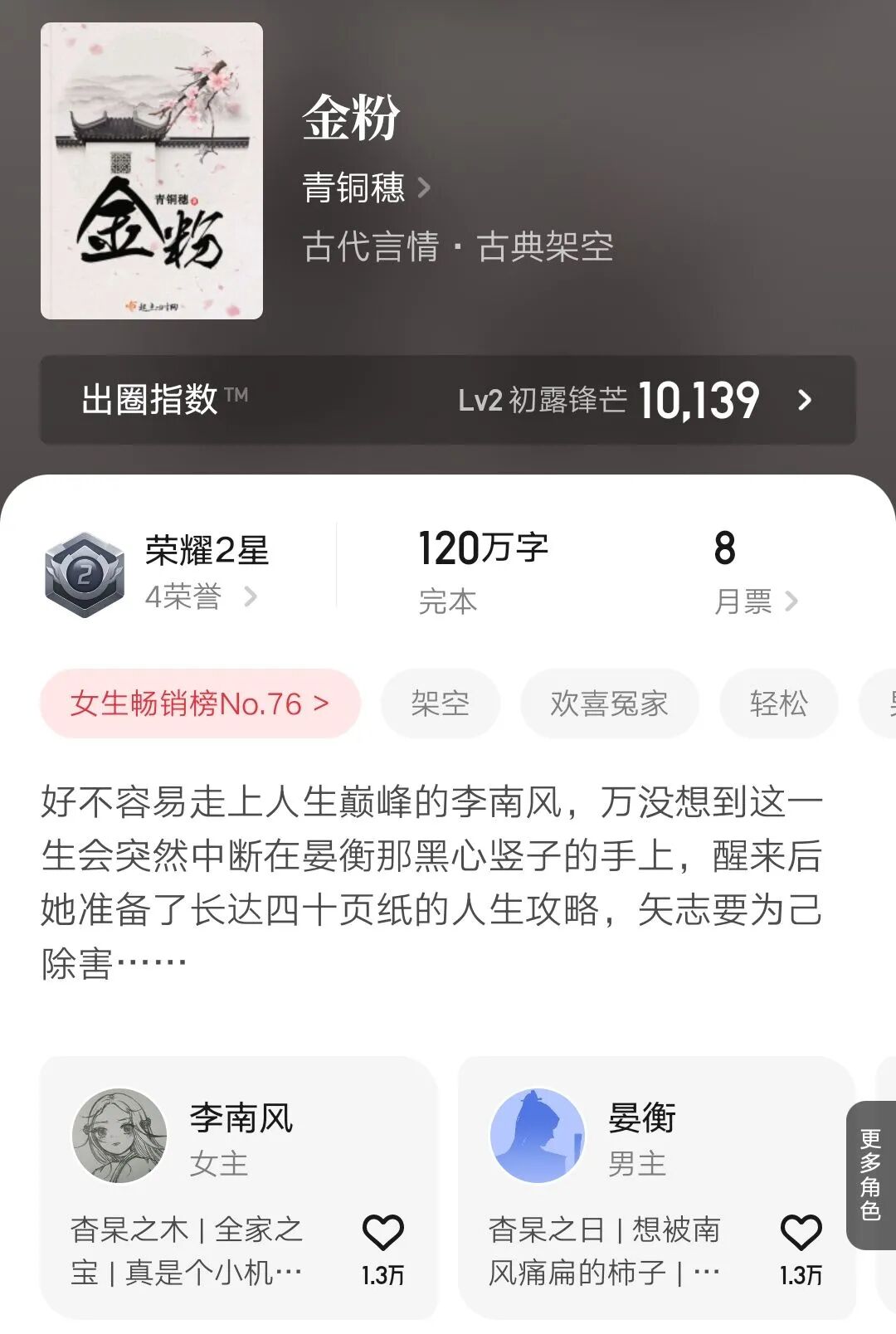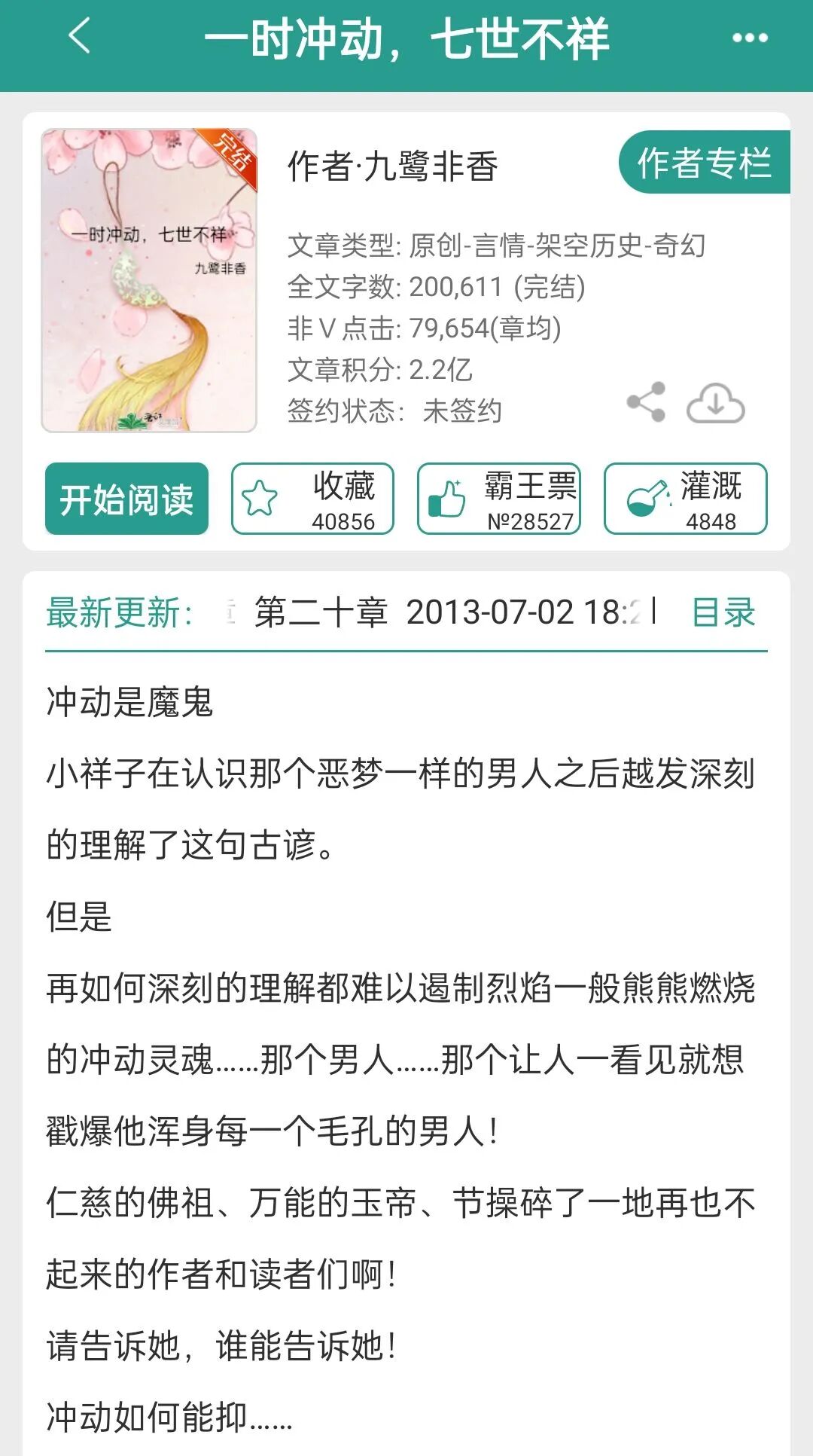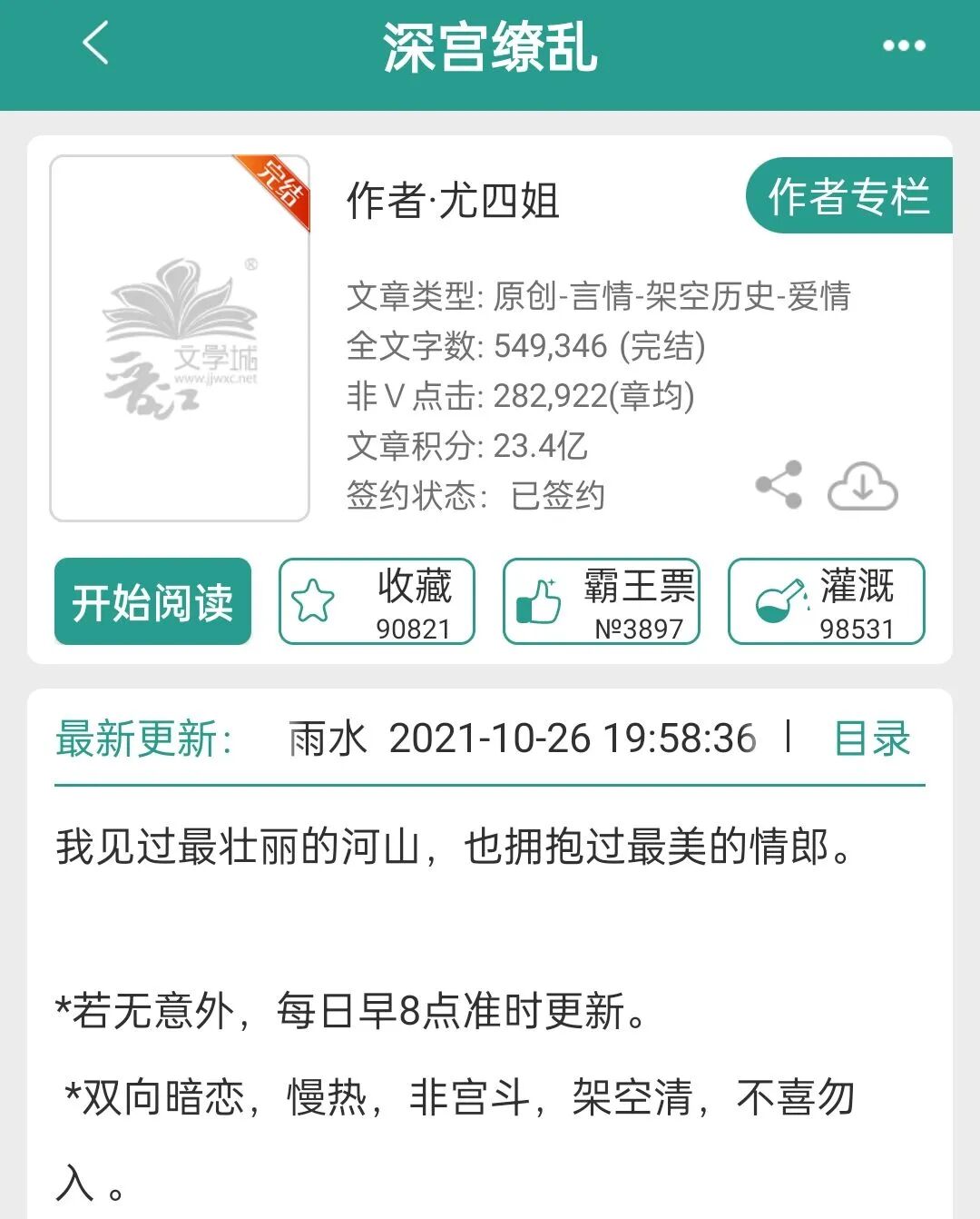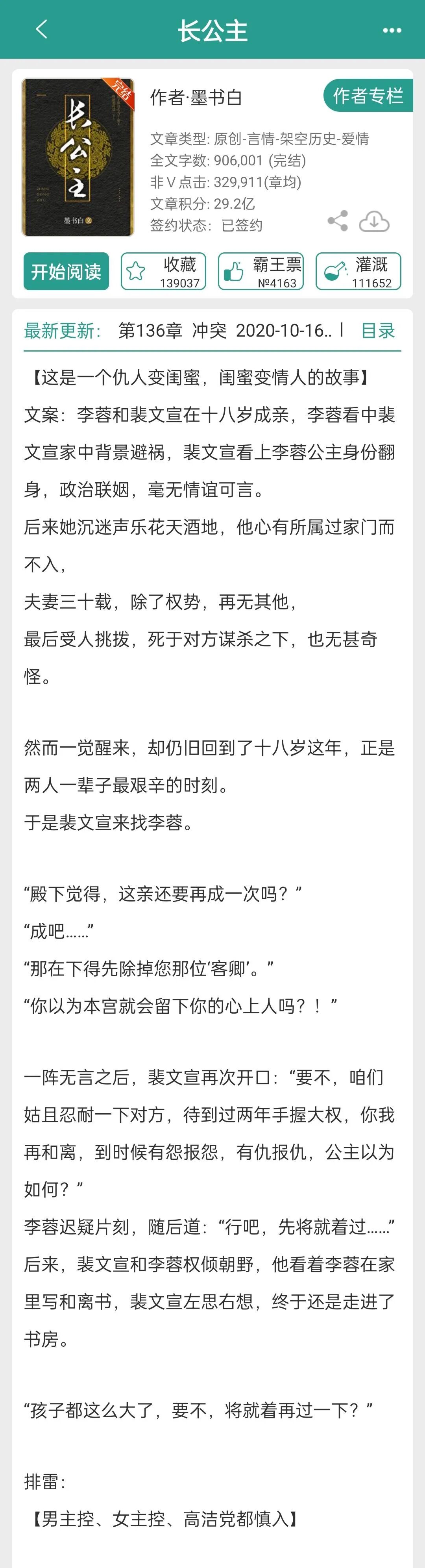 1.《云上青梅》BY 许乘月2.《灭了天道后我成了死对头的师妹》BY 归山玉3.《我与宿敌成双对》BY 赏饭罚饿4.《天作不合》BY 许乘月5.《长公主》BY 墨书白6.《物色》BY 时镜7.《金粉》BY 青铜穗8.《一时冲动,七世不祥》BY 九鹭非香 9.《夫君位极人臣后》BY 维和粽子 10.《与宿敌成亲了》BY 布丁琉璃11.《予我千秋》BY 行烟烟12.《深宫缭乱》BY 尤四姐13.《和死对头互穿后》BY 乌合之宴14.《情兽》BY 温昶