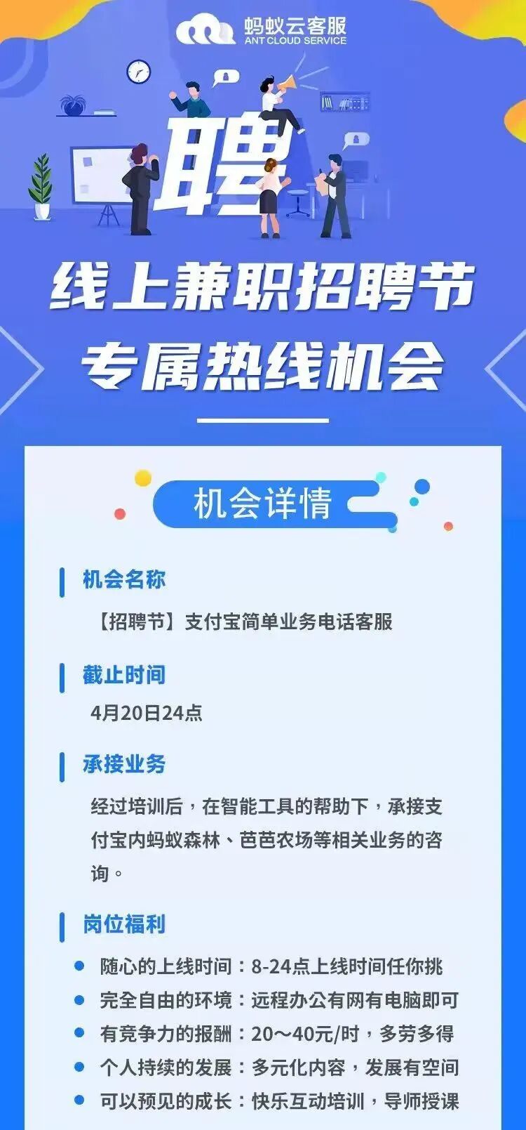 40元/小时 , 蚂蚁云客服,及时回复信息就行,适合学生宝妈~