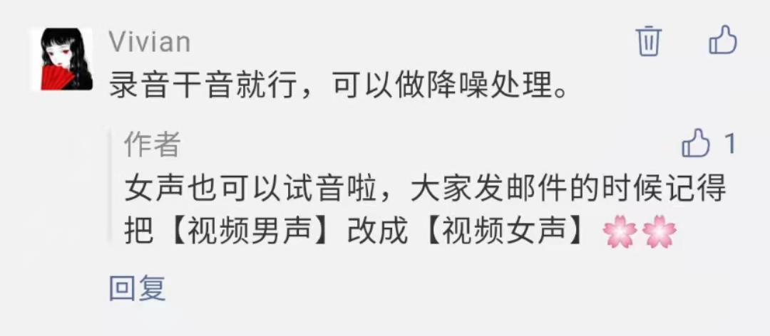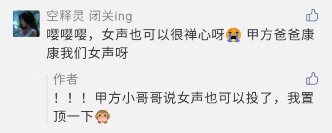 开始是有小姐姐留言提到女声这个,我去转达了一下,甲方小哥哥就说可以女声试音了 :)