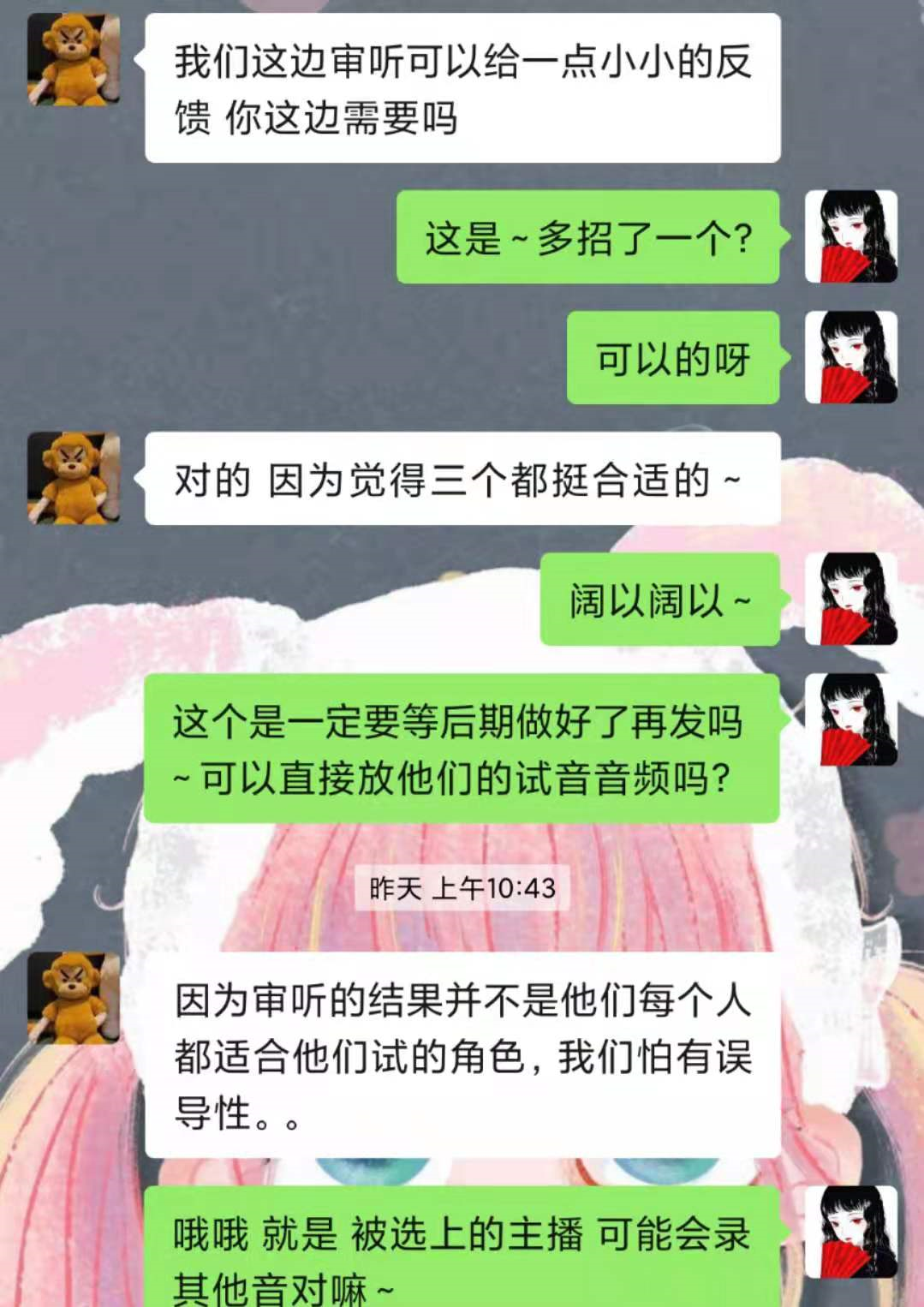 出现以上问题的试音文件中其实不乏音色和戏感都能贴合角色的音频,很遗憾,简单列述望能提供些许帮助,并祝大家以后越来越好。